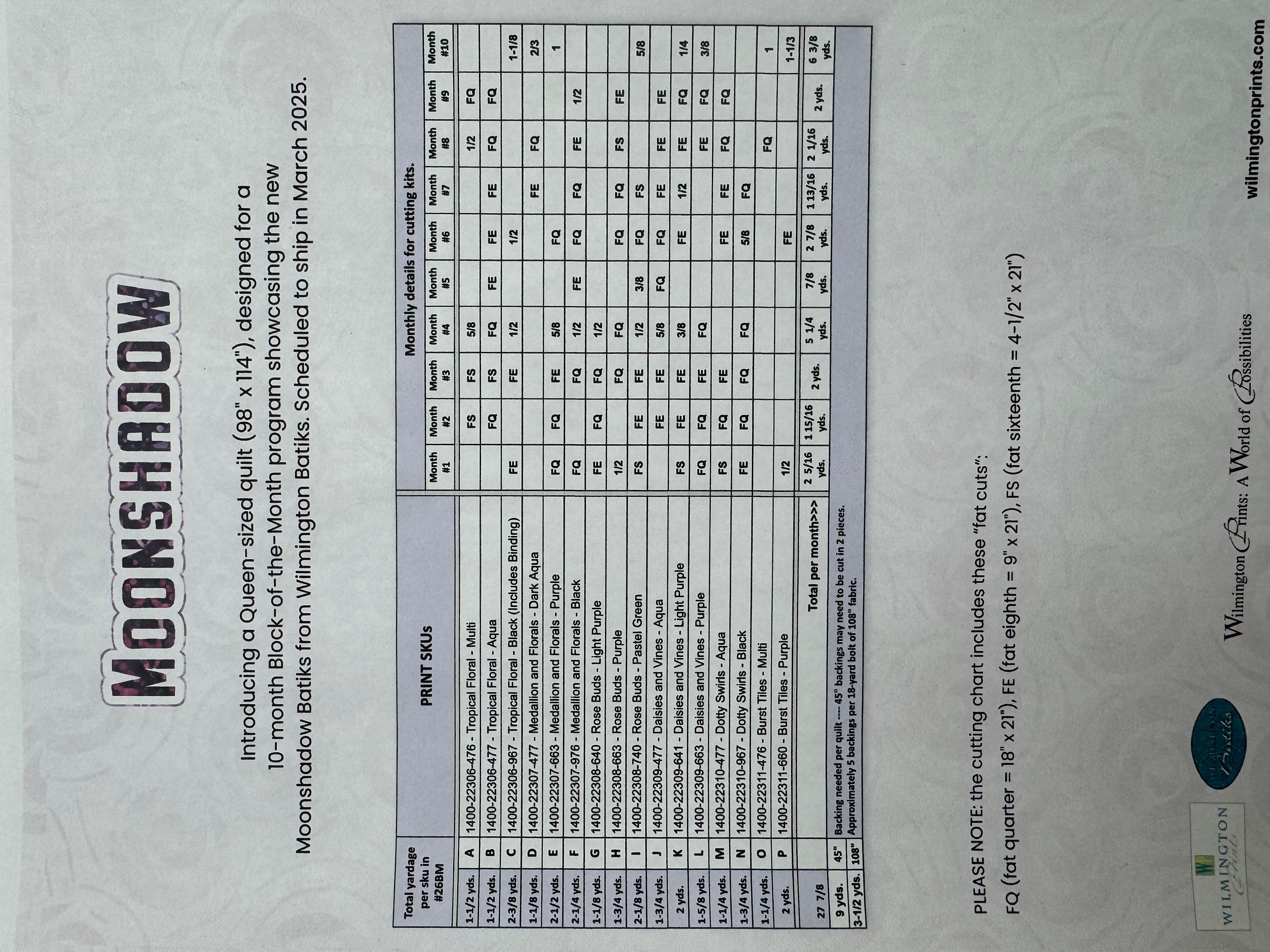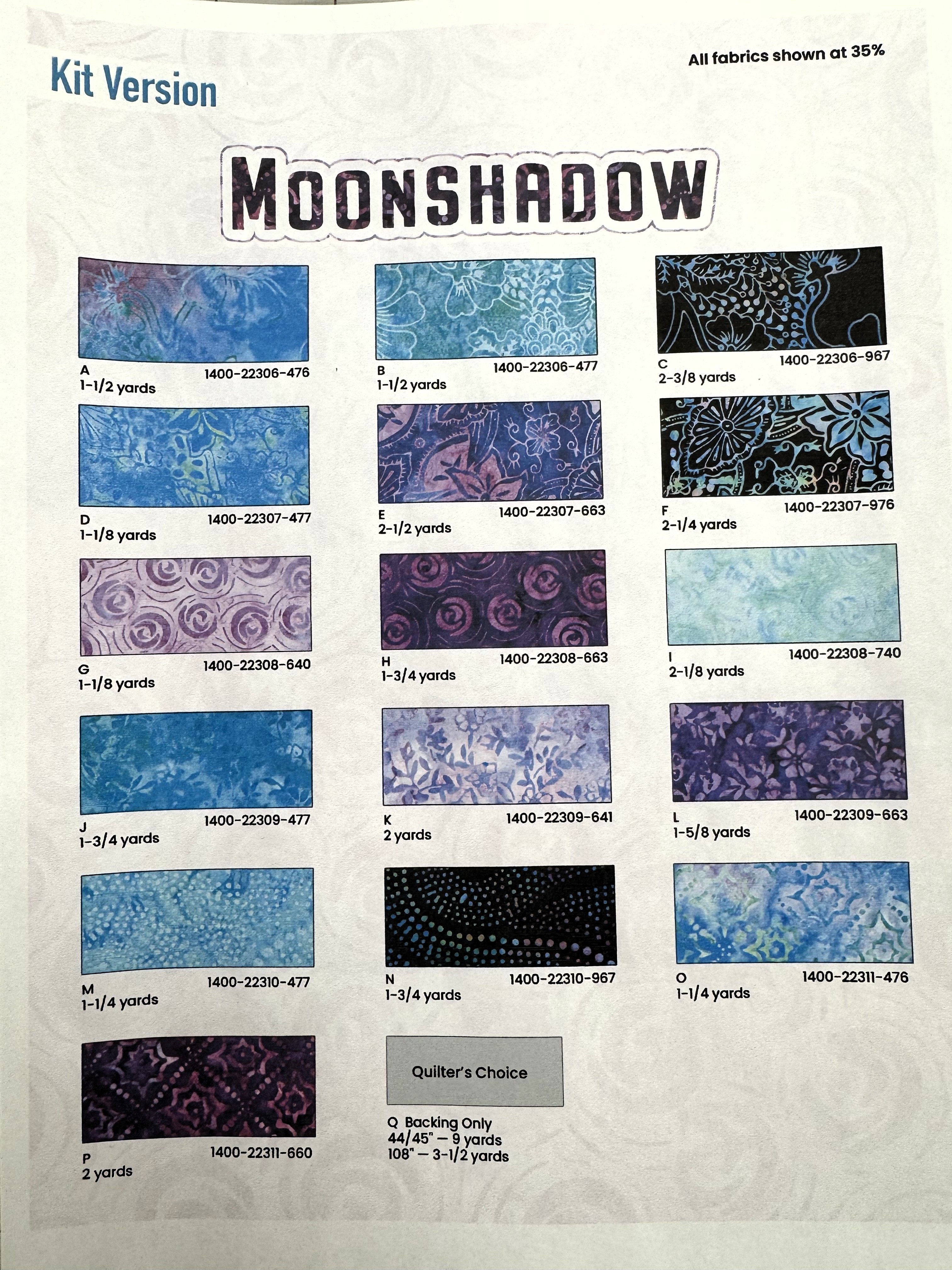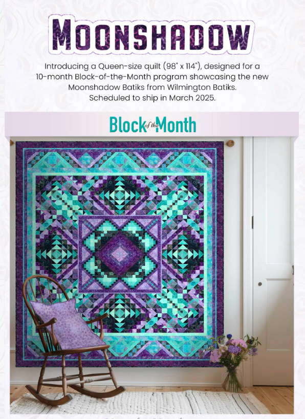 Moonshadow is a stunning 10-month Block of the Month quilt designed for confident beginners and experienced quilters alike. This beautiful queen-size quilt (98" x 114") showcases rich batik fabrics from our new Moonshadow collection in dreamy shades of purple, teal, and black. Each month features clear, manageable blocks using half-square triangles, stitch-and-flip techniques, and strip sets—making the journey fun, approachable, and rewarding. Batting, backing, and binding are sold separately so you can customize your quilt.