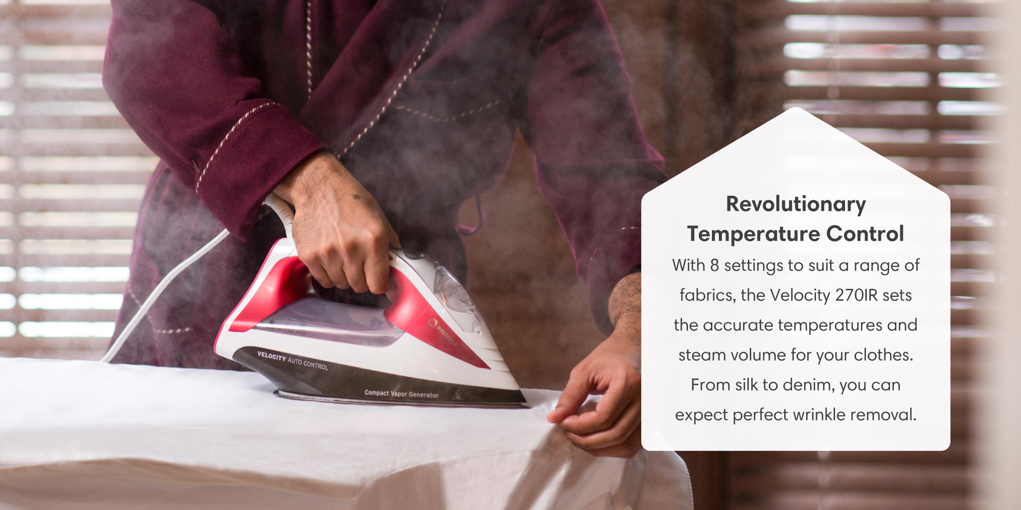 The Velocity Auto Control 270IR is full of features including the sensor steam handle and 8 pre-programmed settings that put you in control to give you the ultimate ironing experience. The Velocity 270IR’s patented built-in steam generator produces endless continuous steam with no leaks.