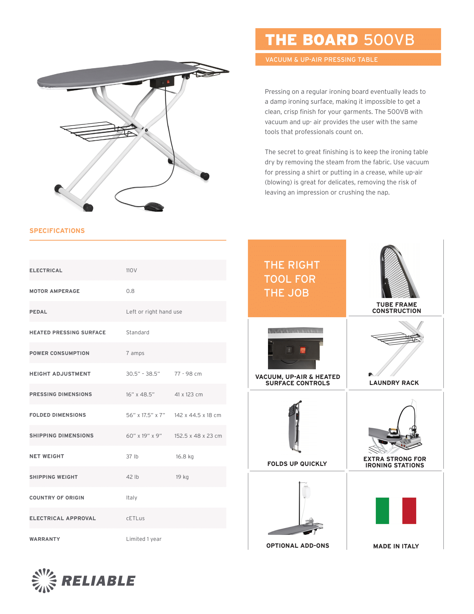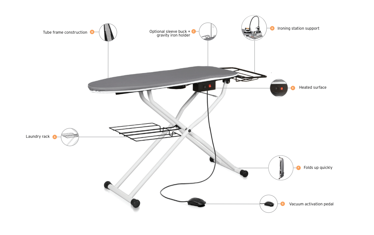 The 500VB with vacuum and up- air provides the tools that professionals count on. Pressing without vacuum leads to a damp ironing surface, making it impossible to get a clean, crisp finish for your garments. The secret to great finishing is to keep the ironing table dry by removing the moisture from the fabric. Use vacuum for pressing a shirt or putting in a crease, while up-air (blowing) is great for delicates, removing the risk of leaving an impression or crushing the nap.