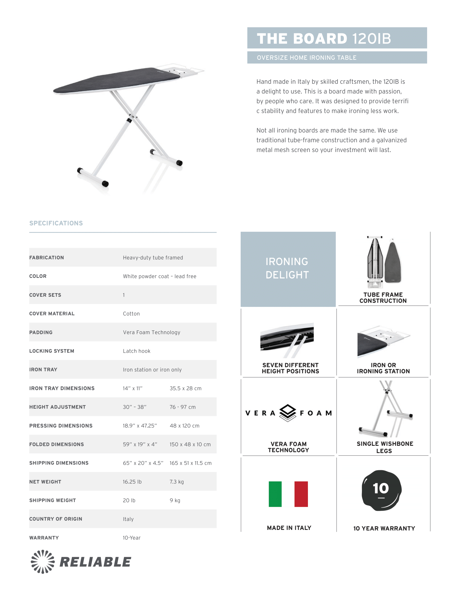 Reliable The Board 120IB Home Ironing Board With Vera Foam Cover Pad